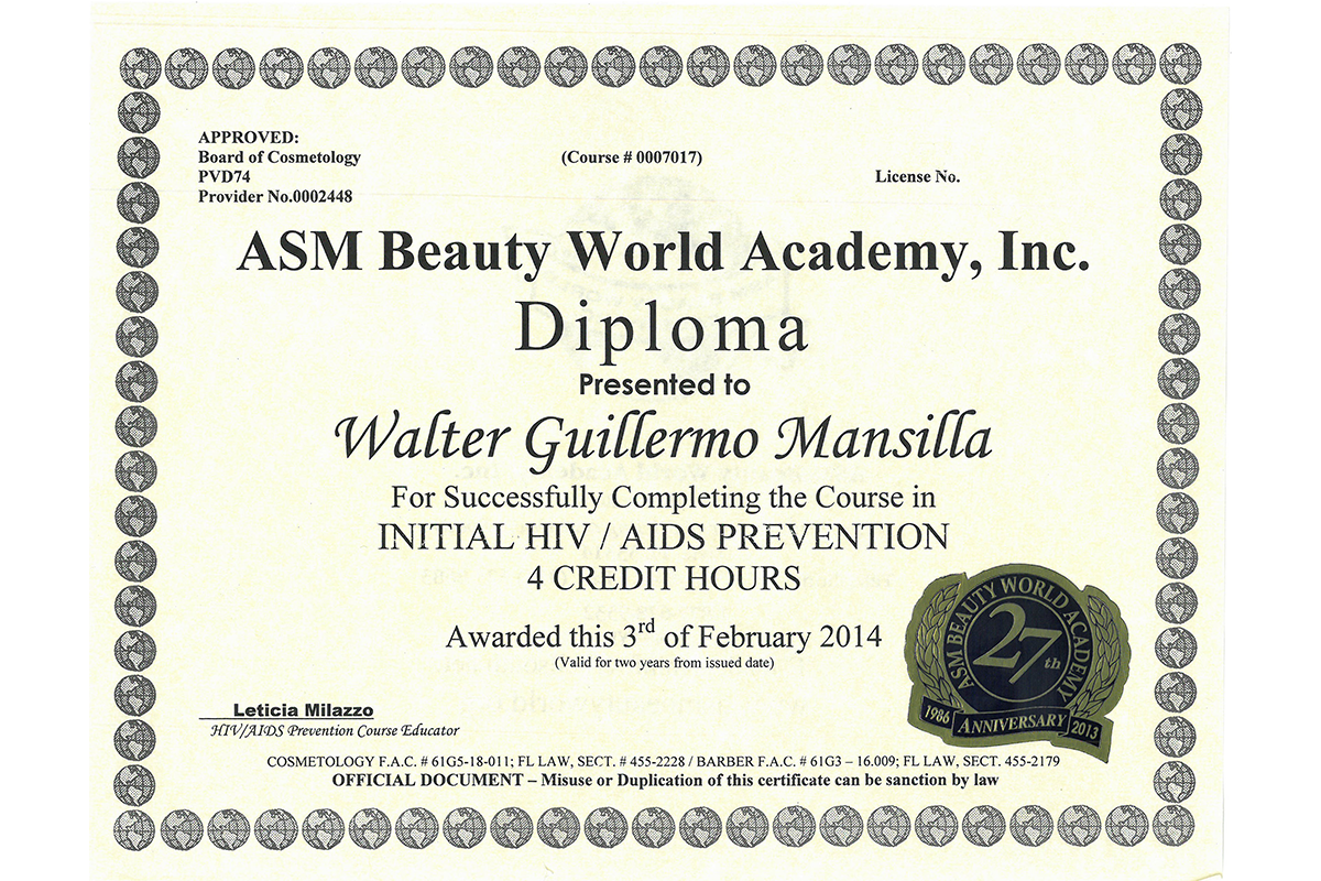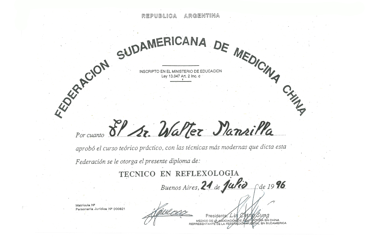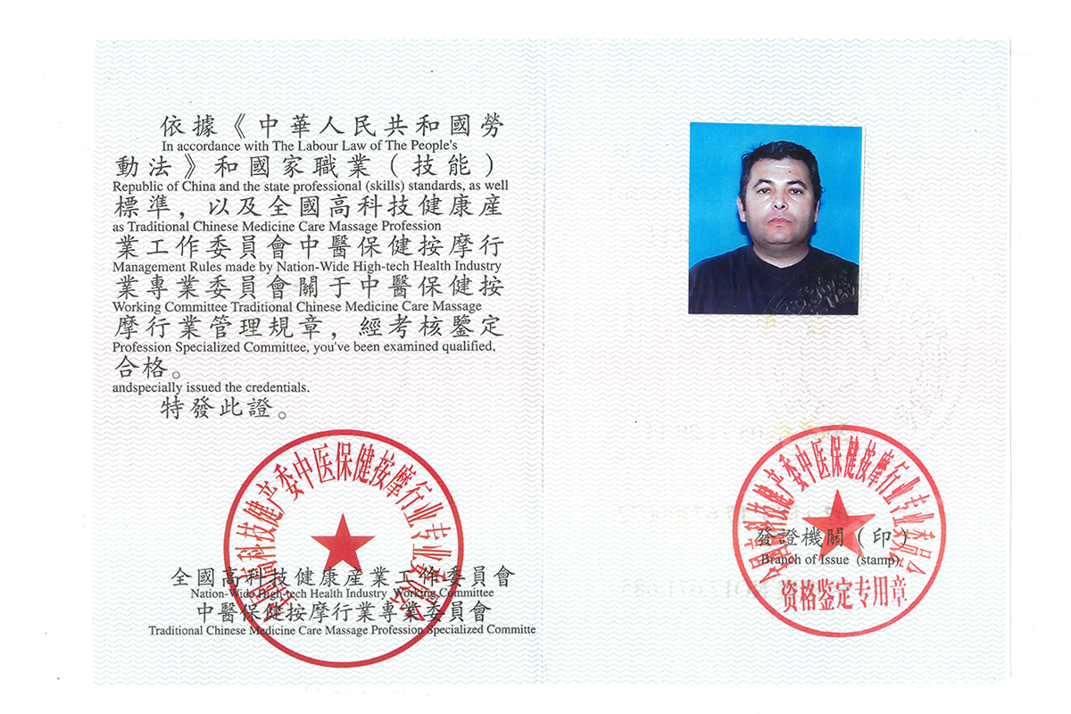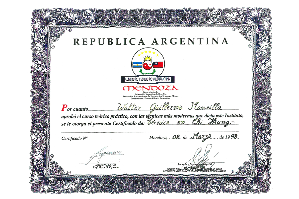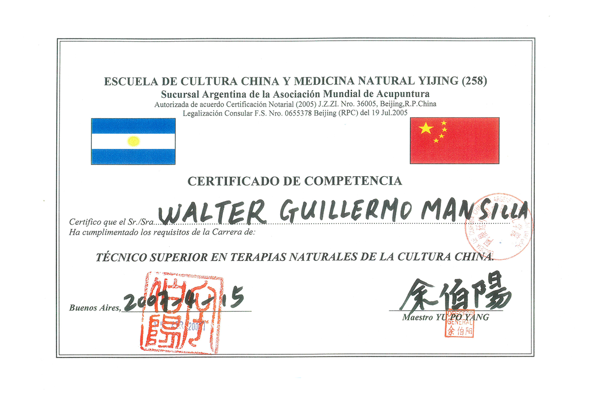 Títulos y Certificaciones: Reflexología Antigua, Digitopuntura, Gua Sha, Tui Na, Chi Kung, DOCTOR EN ACUPUNTURA (En 2011 se especializa en China en Acupuntura de Microsistemas del cuerpo humano), Dietoterapía, Medicina Sexual China, Fen Shui tradicional chino, Medicina China Preventiva.