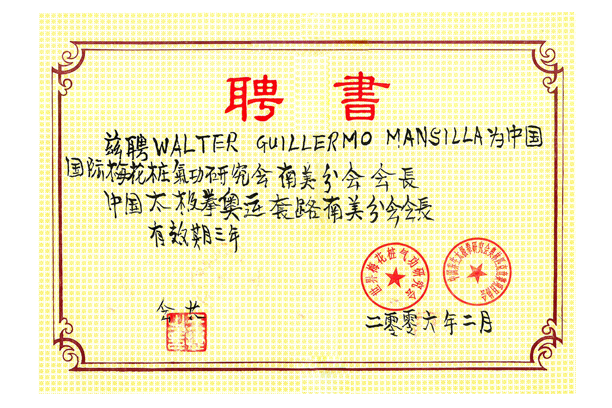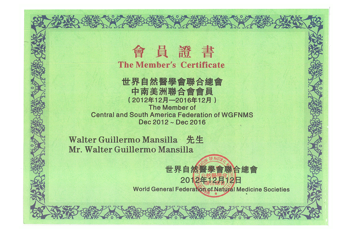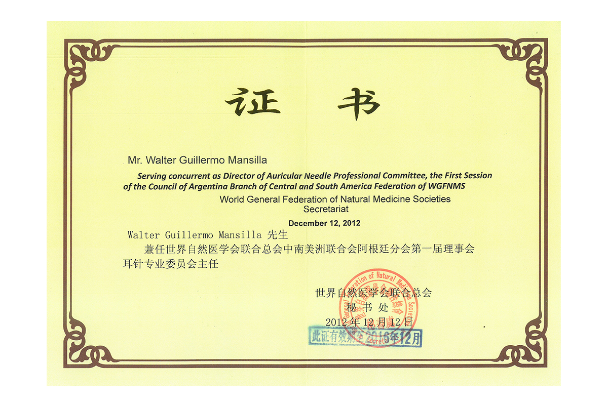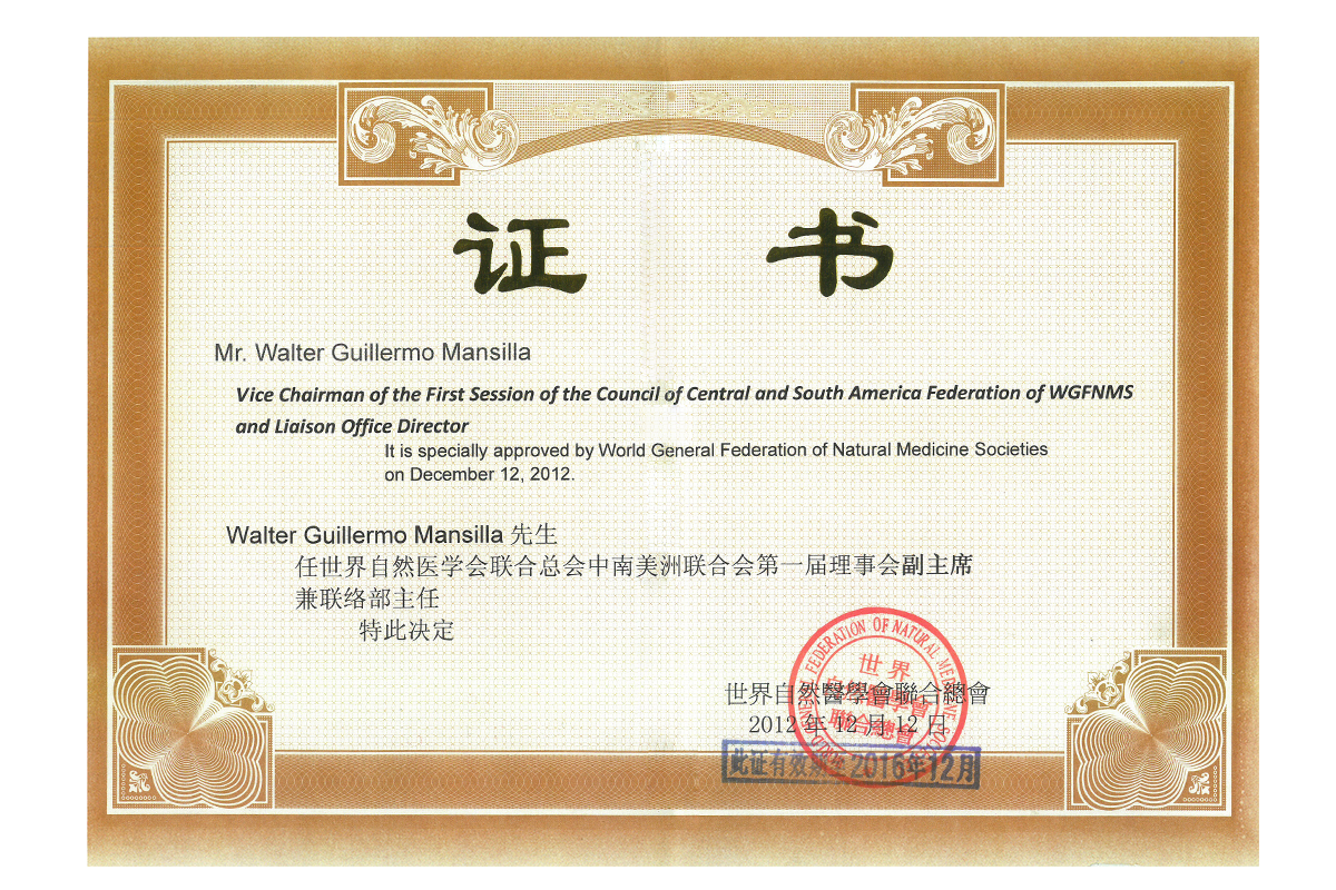 En el año 2012 fue invitado y luego designado por la Federación Mundial de la Medicina Natural (World General Federation Of Natural medicine societies) como Vicepresidente y Director General del comité profesional de acupuntura auricular para toda América Central y Sudamérica. Creador del sistema WEI ZHEN.